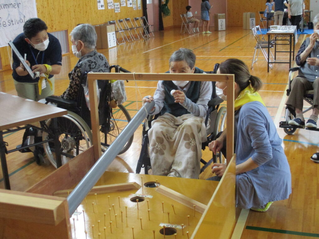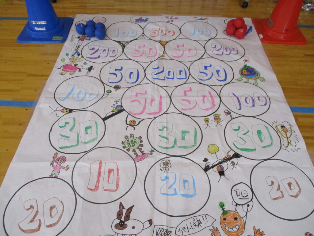 ボッチャ: パラリンピック競技として知られるボッチャを千寿荘オリジナルにアレンジし、ご利用者の方々も積極的に参加され、子どもたちとの交流の場となりました。